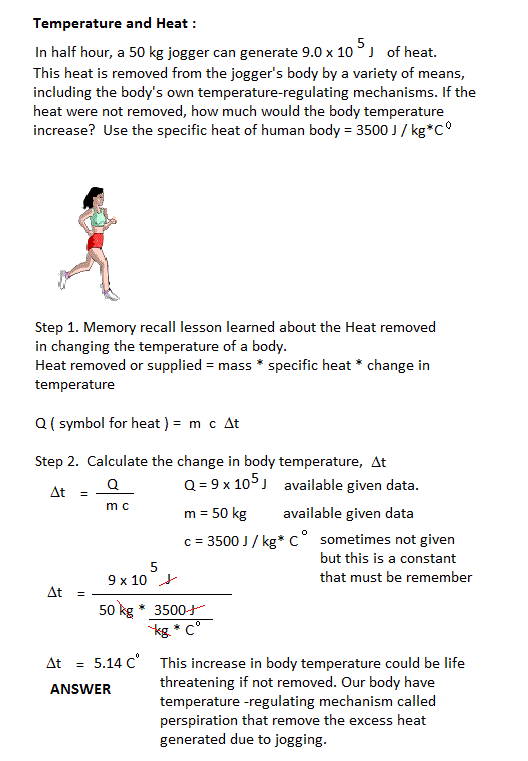 Q = 900,000 joules can be written as 9e5 for human body jogging for half hour.