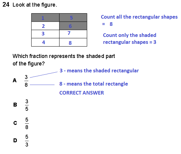 The State expected the 4th grade student to demonstrate their understanding on how to represent fraction. For example fraction can be represented by using shaded rectangle. Student should now realize that shading of rectangle can represent mathematical ideas of equal sharing in fraction.