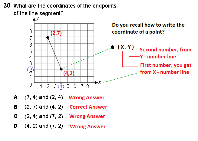 The State expected the 4th grade student to master the concept of writing and reading coordinates of a point. Why it is very important to master the coordinate system? Because the student are going to use it in algebra, measurement, geometry, and data analysis. In the line graph shown below the question is what are the coordinates of the endpoints of the line segment? The student must remember that coordinates of any point follows the same rule