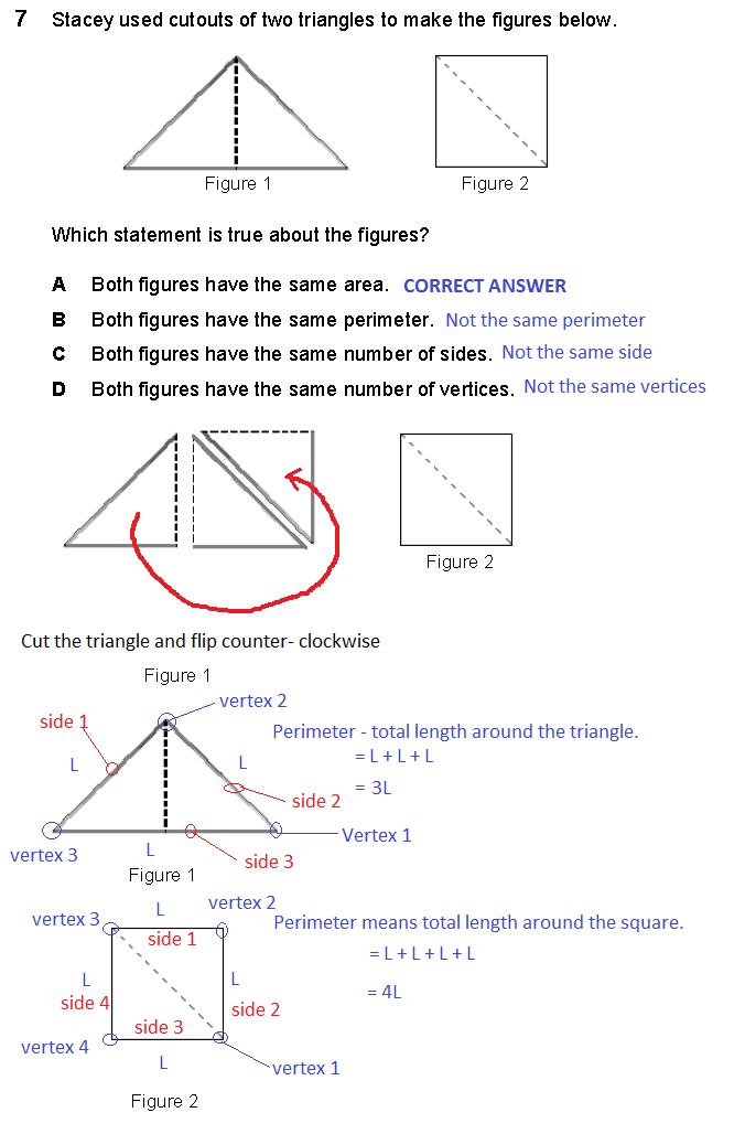 The State expected 4th grade students to have early exposure to the concept of geometric relationship of shape. Geometry teaches student how to reason and justify their solution. Like for example the shape below looks different but geometry teaches you they have the same calculated area. Geometry also gives student the opportunity to develop their communication skills explaining why the two shapes have not the same perimeter, have not the same count of sides, and have not the same count of vertices. As you can see from the shapes, student must learn to gather definition of word or term like the word "side" , the word "perimeter", and the word "vertices".