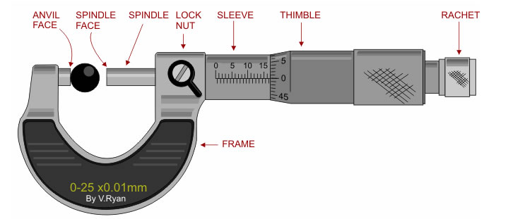 This instrument is called a micrometer, used to measure the diameter of the small black ball shown below. Did you see the benchmark or marking on the instrument?