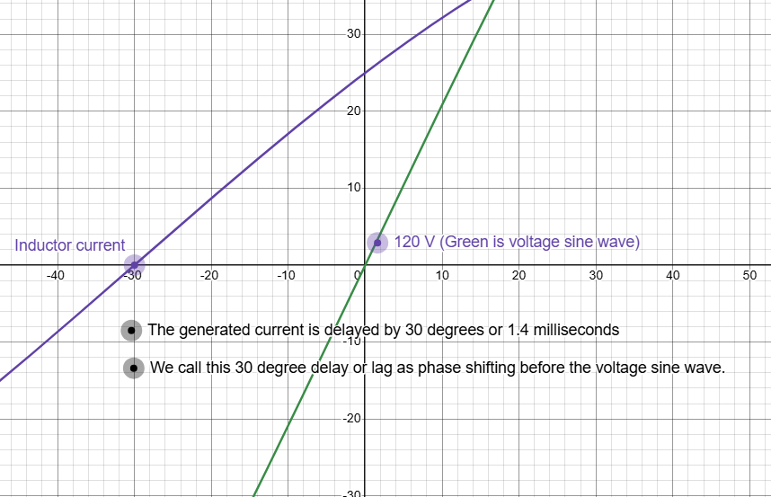 If a sine wave AC voltage source is applied to a purely inductive load, the current is at maximum when the voltage begins to rise from zero volt, and the current is zero when the voltage across the inductor is at maximum. The voltage lags 90° with the current by looking at the graph shown in the right. The current lags the applied voltage by 90° is another way of describing the dependency of current to the applied voltage in a purely inductive circuit.
