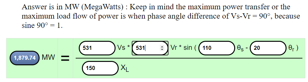 Answer is in MW (MegaWatts) : Keep in mind the maximum power transfer or the maximum load flow of power is when phase angle difference of Vs-Vr = 90°, because sine 90° = 1.