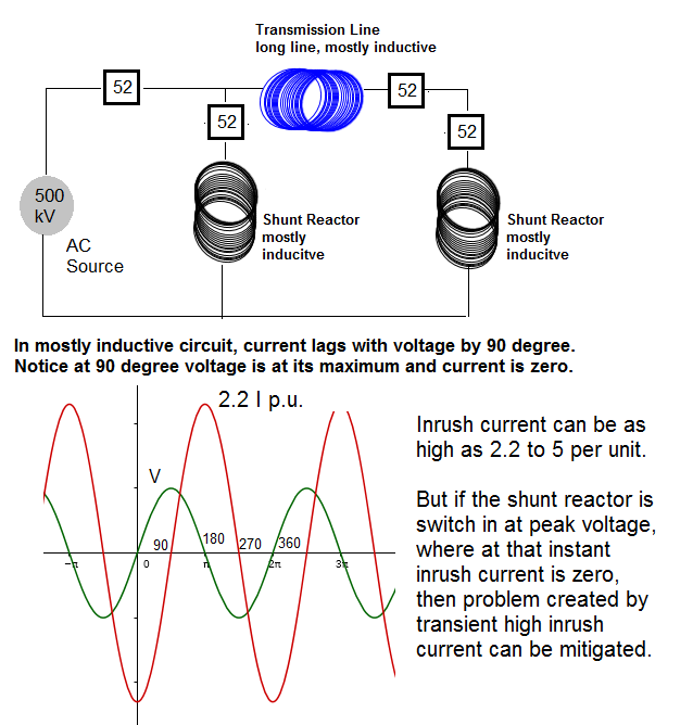 So what is the solution to this problem? Remember the worst condition of inrush current can happen only at precisely zero voltage refer to the graph above. Furthermore the graph is also helping us to see that at precisely 90° , 270° or at exactly maximum voltage, generated current is zero (0) for all mostly inductive circuits like shunt reactors and long transmission lines. The solution therefore is to specify power circuit breaker (PCB)) that is designed to do switching of shunt reactor. This special PCB has the ability to precisely switch in consecutively each shunt reactor phase A, phase B, and phase C at peak voltage. So what is the importance of switching at the peak voltage? At the peak voltage there is no inrush current flowing or very limited inrush current. Therefore the magnetic circuit or laminated steel cores of the shunt reactor will not get saturated quickly.