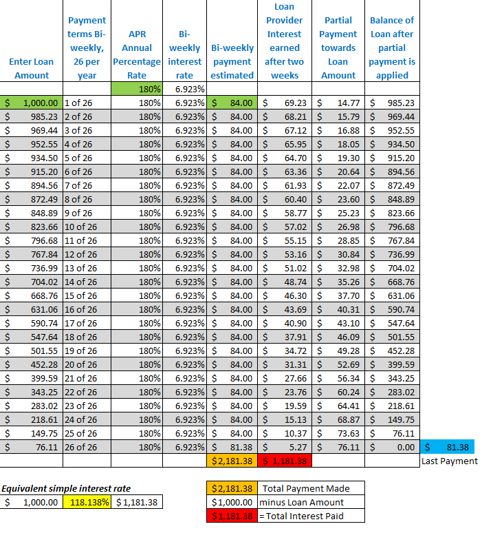 Formula Recallinterest payment, i = Loan Amount * simple interest rate Total Payable = Loan Amount + interest payment Calculated Monthly Payment = Total Payable/12 months Calculated Bi-Weekly Payment = Total Payable/26 weeks |