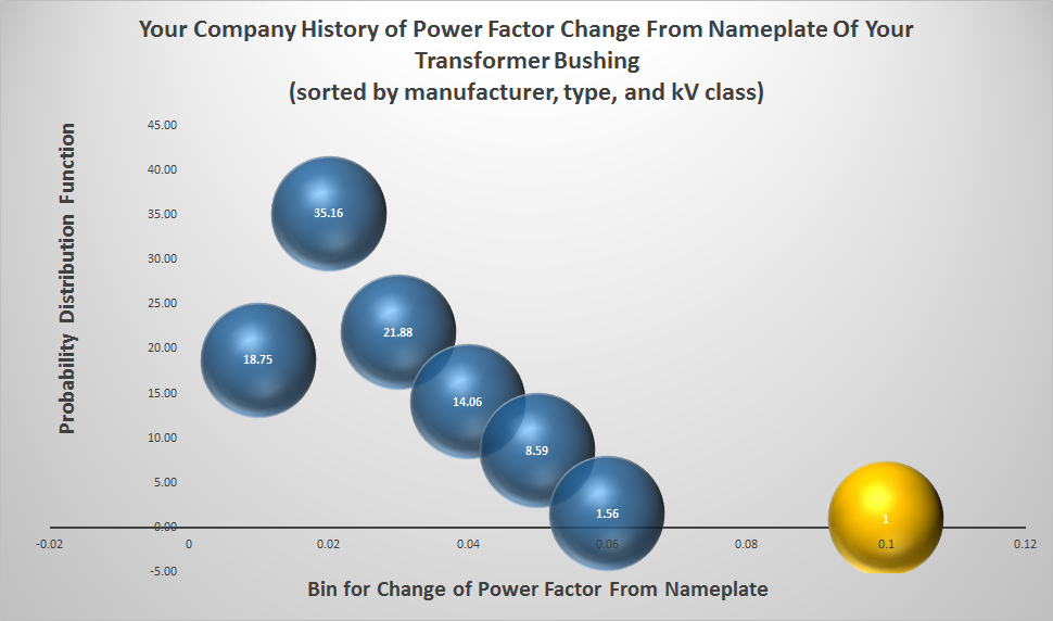 FIGURE 4 Probability Distribution Function Shown in 3D Bubble Graph with Focus Bushing that has change of power factor from nameplate that is an outlier from the 128 bushing testing session history