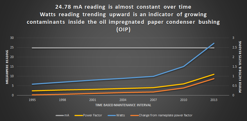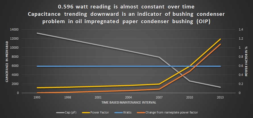 Next step after having the list of bushing that needs more attention is using the trending analysis of power factor measurement, capacitance measurement, and watt measurement.