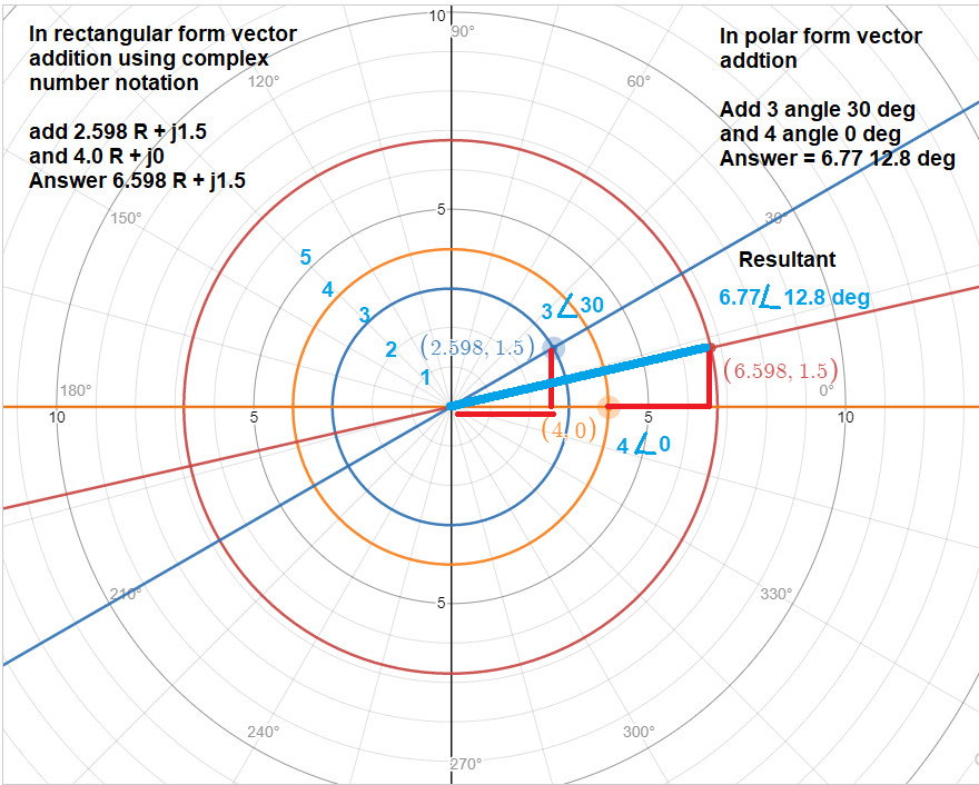 C = Red color is the answer, the resultant of adding two vectors given in phasor notation. The answer is express in rectangular form.