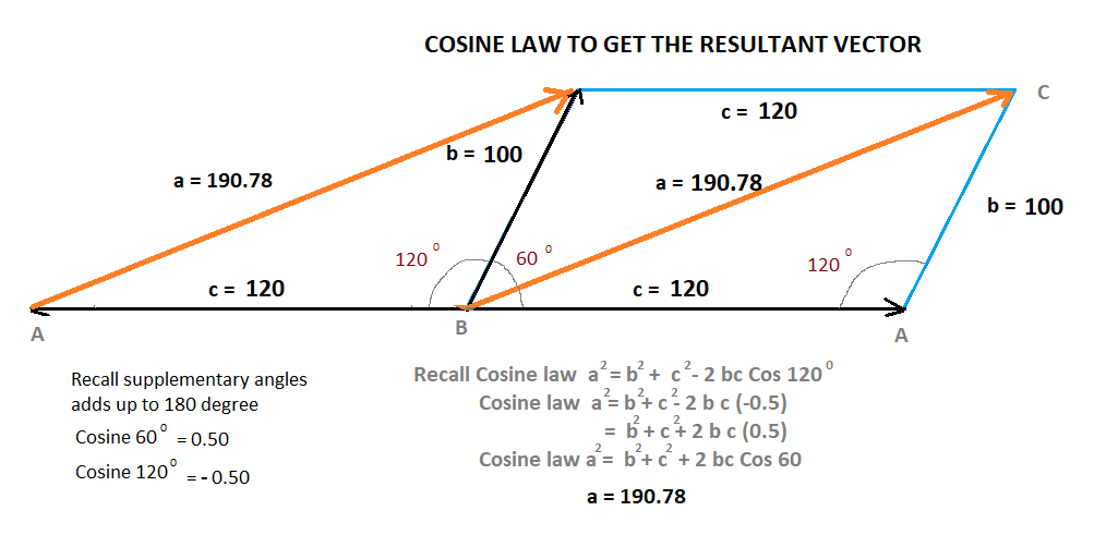 The resultant vector is side "a". Given vectors are side "b" and side "c". The derived internal angle is 120 ° The calculator below is modified version of cosine law as shown