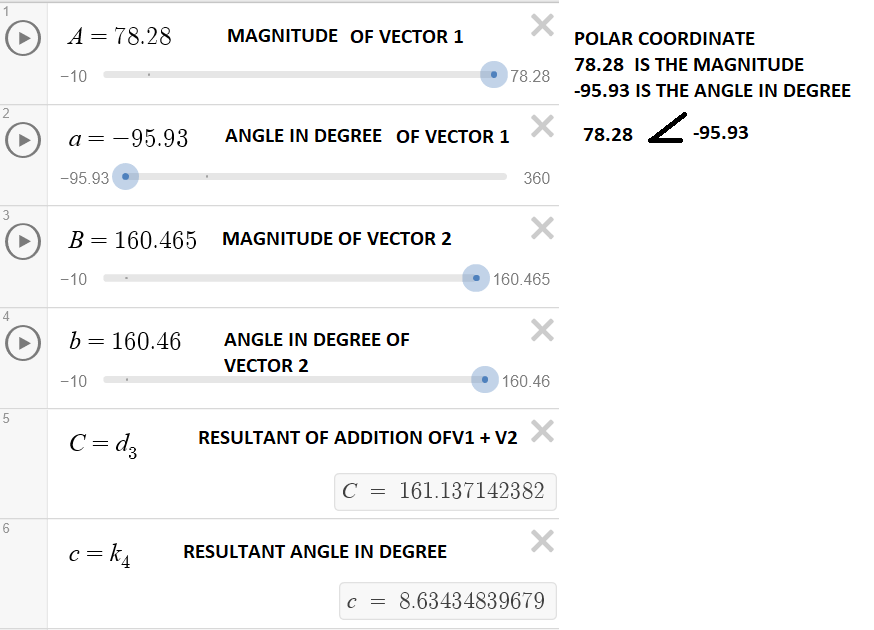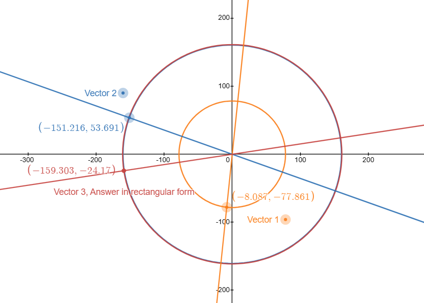 Add two vectors in polar form. 78.28 angle -95.93 degree + 160.465 angle 160.46
