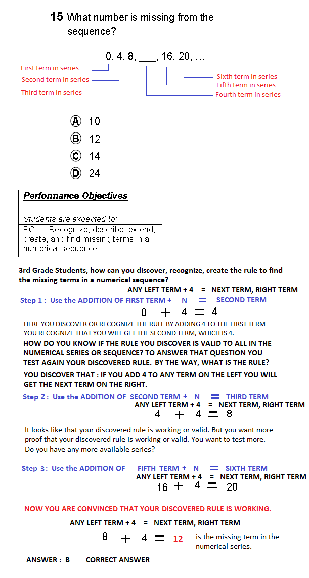 The State expected 3rd grade students to use their previous knowledge in addition to solve number sequence problem. Also to have pre-algebra exposure by learning how to analyze a problem situation, determine the question(s) to be answered, and determine how to represent the problem. For example learning to discover the mathematical rule in number sequence.