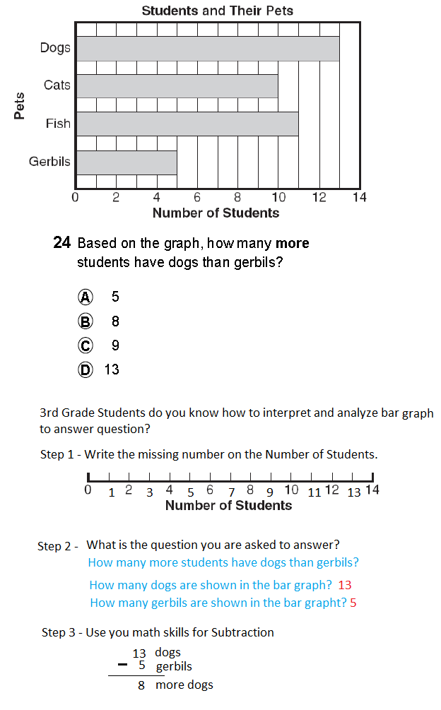 The State expected 3rd grade students early exposure to data analysis. Student can connect their previous knoweledge about numberline and benchmark reading to analyze and interpret bar graph to answer question. Example of question, based on the graph, how many more students have dogs than gerbils?