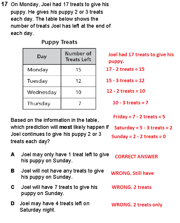 The State expected 4th grade student to have early exposure to the concept of probability or likelihood that something will happen. The concept of probability is very important in higher mathematics. This is a challenging question for 4th grader but appropriate because it involves only 17 whole numbers. Student should try using their previous acquired skill like drawing or sketching or paper pencil calculation of the given information. Our brain can process information quickly once we see the sketches or drawing.