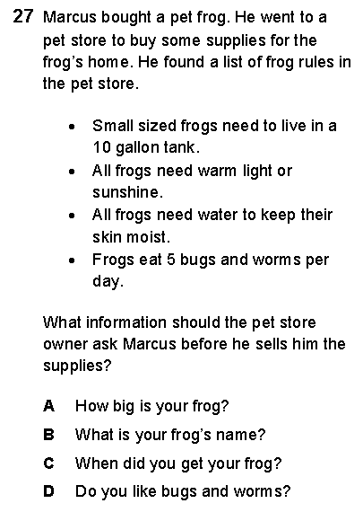 The State expected the 4th grade student to demonstrate their data analysis and problem solving skills. Data analysis include determining the right question(s) to ask and determining the relevant data according to the given situation. For example the Frog's rule is a relevant information.