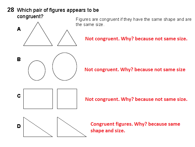 Geometry teaches student how to reason and justify their solution. It teaches student the concept of attributes of geometrical shapes. For example the attribute congruent, it means the shape are congruent if they have the same shape and are the same size. Remembering the definition of congruent, the student should be able to answer the question, which pair of figures appears to be congruent?