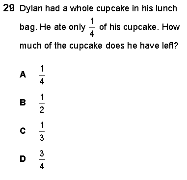 The State expected the 4th grade student to master the concept of fraction as representation of equal sharing. For example in equal sharing of cupcake. When 1/4 of the cake was eaten, what does it mean to student. First the student will ask what is the denominator? The answer is 4, it means the cupcake was equally divided into 4 parts. Then the student will ask what is the numerator? The answer is 1, meaning 1 part was eaten. Now it is easy for student to answer the question how much of the cupcake does he have left? The student will simply do subtraction which they already master. 4 - 1 = 3. Written in fraction 3 / 4 . Student can also make a drawing to show the meaning of fraction.