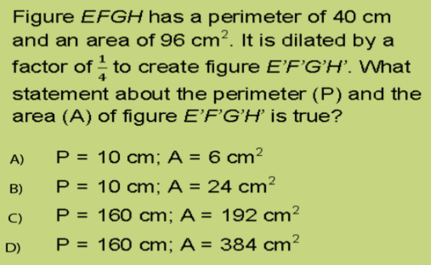 Next Next post: What statement about the perimeter (P) and the area (A) of figure E’F’G’H’ is true?