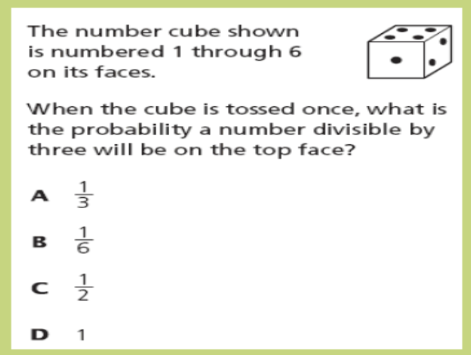 The number cube shown is numbered 1 through 6 on its faces. When the cube is tossed once, what is the probability a number divisible by three will on the top face? The number cube shown is numbered 1 through 6 on its faces. When the cube is tossed once, what is the probability a number divisible by three will on the top face? advertisement