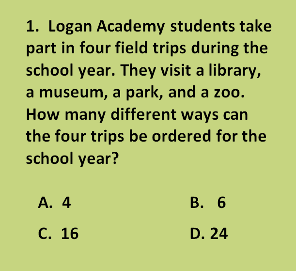 1. Logan Academy students take part in four field trips during the school year. They visit a library, a museum, a park, and a zoo. How many different ways can the four trips be ordered for the school year?