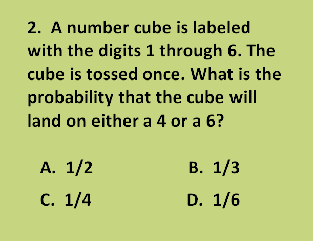2. A number cube is labeled with the digits 1 through 6. The cube is tossed once. What is the probability that the cube will land on either a 4 or a 6?