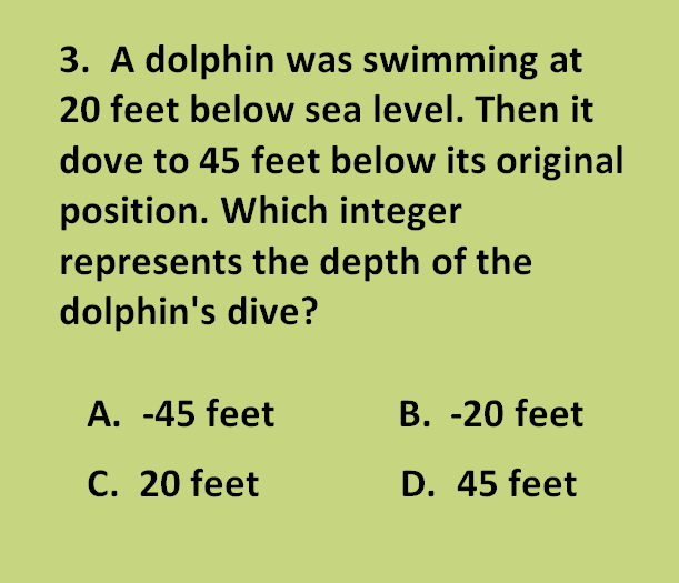3. A dolphin was swimming at 20 feet below sea level. The it dove to 45 feet below its original position. Which integer represents the depth of the dolphin's dive?