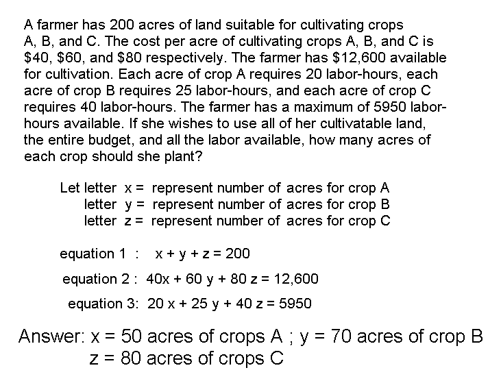 Constraint number 1: the total number of acres to plant crop A, crop B and crop C is equal to 200 acres. First step assign variable letter x = number of acres needed to plant crop A