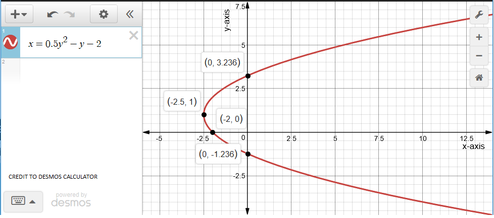 x(y) = 0.5y2 - 1y -2 the vertex answer will be x = 1 and y = -2.5 after changing : x = -2.5 and y = 1 you will get the vertex of x(y). See Graph 3 shown below as proof.