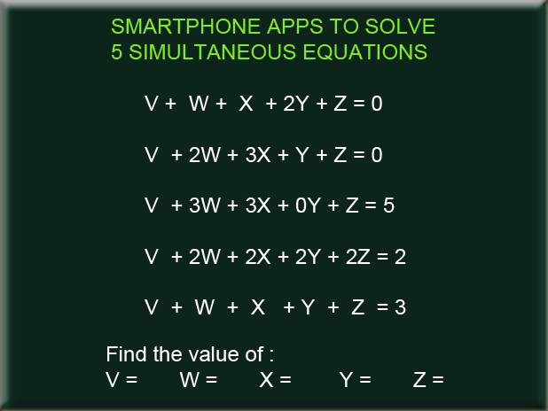 HOW TO USE: For new scenario simply enter new number or click the clear button for totally new calculation. If the coefficient of V, W, X, Y, and Z is negative, you must use it. For example - V , you must input - 1 in V+ column ; another example - 3 W , you must input - 3. in W+ column