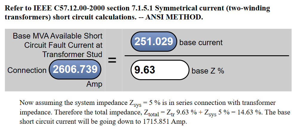 What is the infinite bus method of estimating the short circuit current? This is my personal understanding base on my mathematical knowledge, if you divide per unit voltage by zero impedance Z you will get almost infinite current ( I = V/Z = 1/0 = infinity fault current or maximum fault current ). So, to get the maximum fault current , you need to set the value of impedance Z to be almost 0 like 0.00000099 ohms. The only impedance to limit the fault current is the transformer impedance. All other impedance are neglected or assigned a value of almost zero. Another explanation of infinite bus is constant voltage and frequency. In order to achieve constant voltage there should be zero voltage drop. Vdrop = I * Z = 0 will only happen if the impedance Z is set to almost zero like 0.00000009.