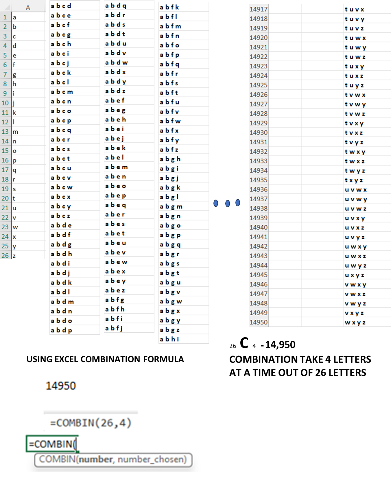For letters Given data = { A, B, C, D } Solve for all possible combination using 2 letters at a time. Counting all the possible combination. Combination number 1 = AB here if you reverse the order of B, BA is not a valid answer, so you will not count it because the ingredient or component are still the same AB = BA. Combination number 2 = AC. Solution = { AB, AC, AD, BC, BD, CD }. If you count the total combination the answer is six possible combination. You will get the same answer if you use the formula. You see mathematician uses formula to speed up the listing process and save time especially if you are solving 26 possible combination of two letters in English alphabet. Try listing and then counting all the possible two letters combination in English alphabet. If you really try it, time your starting time and your finish time and record how long it will take you to arrive at