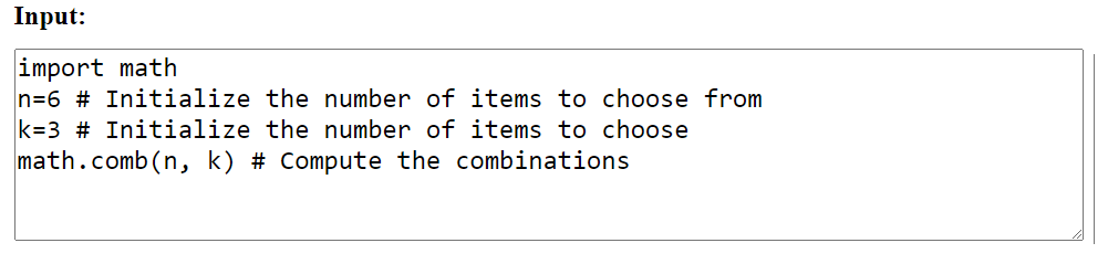 | Step 1. Enter the given total number represented by variable letter n = 6 step 2. Then unique combination , r = 3. Finally click the black button and you get your answer |
