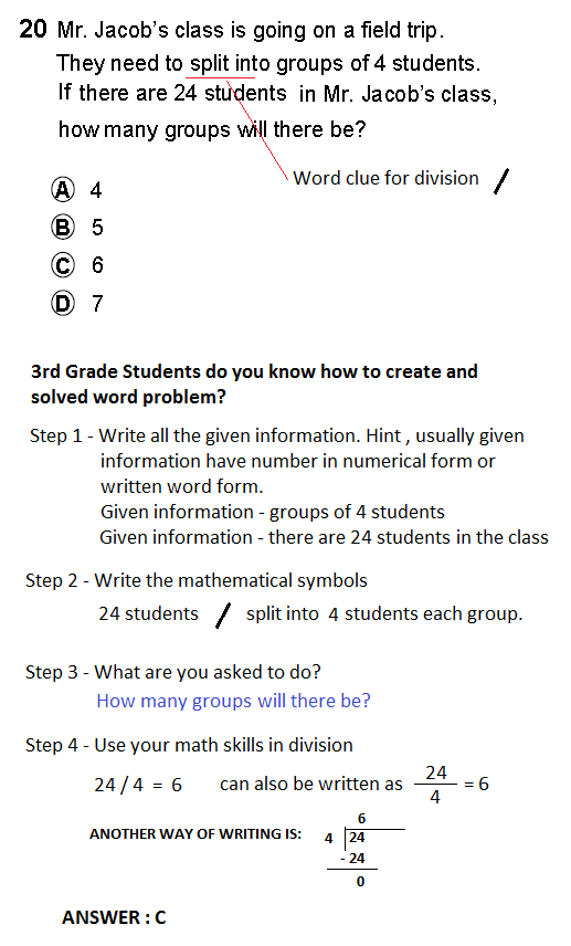The State expected 3rd grade students to master division and multiplication. Also to have pre-algebra exposure by learning how to analyze a problem situation, determine the question(s) to be answered, and determine how to represent the problem. For example extracting quantitative information from word problem and be able to discover the pattern how to solve it.