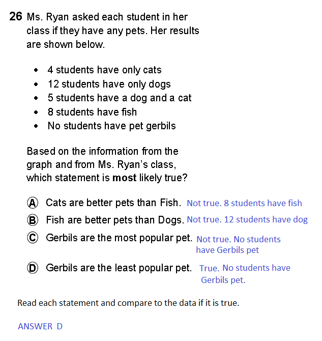 The State expected 3rd grade students to have early exposure to data analysis. Student can connect their previous knowledge about number line and benchmark reading to analyze and interpret bar graph to answer question. Example of question, Based on the information from the graph and from Ms. Ryan's class, which statement is most likely true?