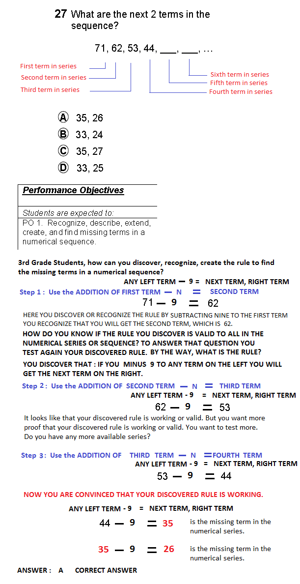 The State expected 3rd grade students to use their previous knowledge in subtraction to solve number sequence problem. Also to have pre-algebra exposure by learning how to analyze a problem situation, determine the question(s) to be answered, and determine how to represent the problem. For example learning to discover the mathematical rule in number sequence.