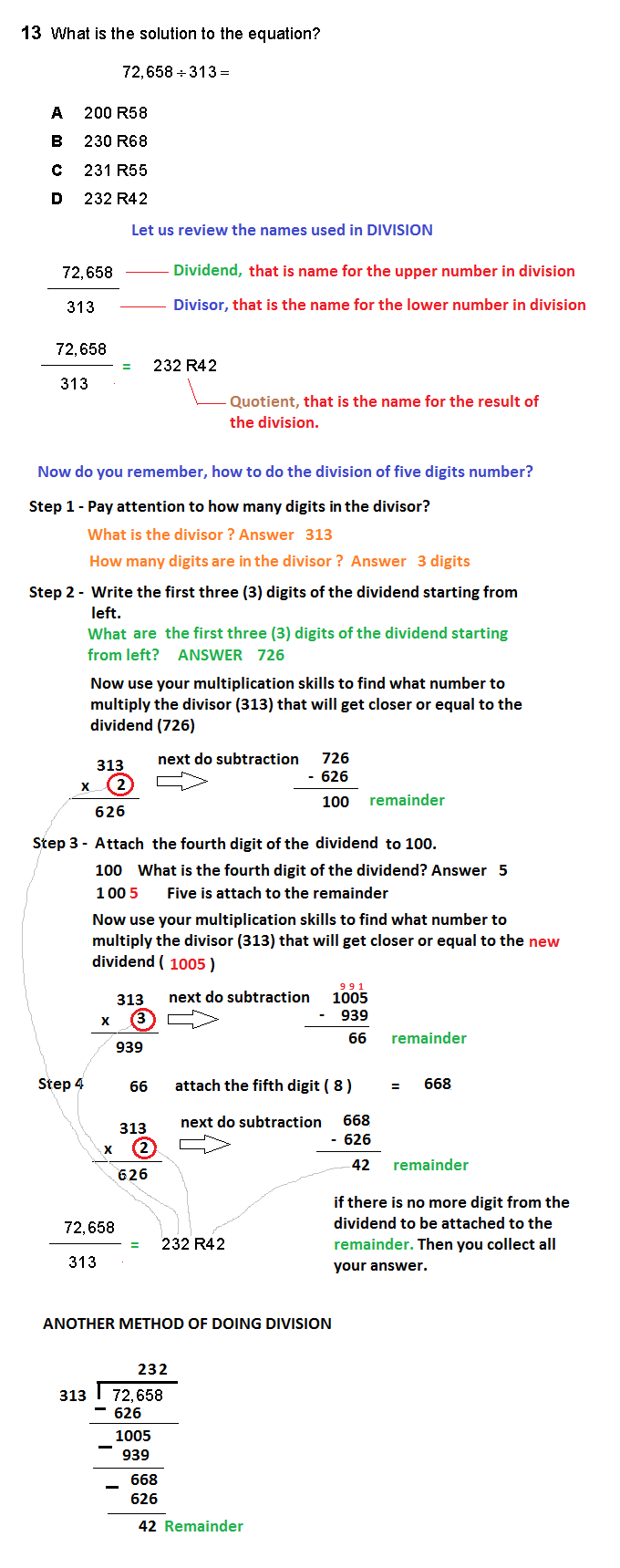 The State expected 5th grade student to master division of five digit numbers. This is also a good transition to learning Algebra, this stage is called Pre-Algebra, Why? Because the student are now ask to find the unknown solution to the equation. Student now beginning to understand that the division skill they learn are important in solving equation. The teacher can start introducing the letter X to represent the unknown solution to the division problem. Algebraic equation is a short statement describing the pattern, association, relationship and general equation or theory.
