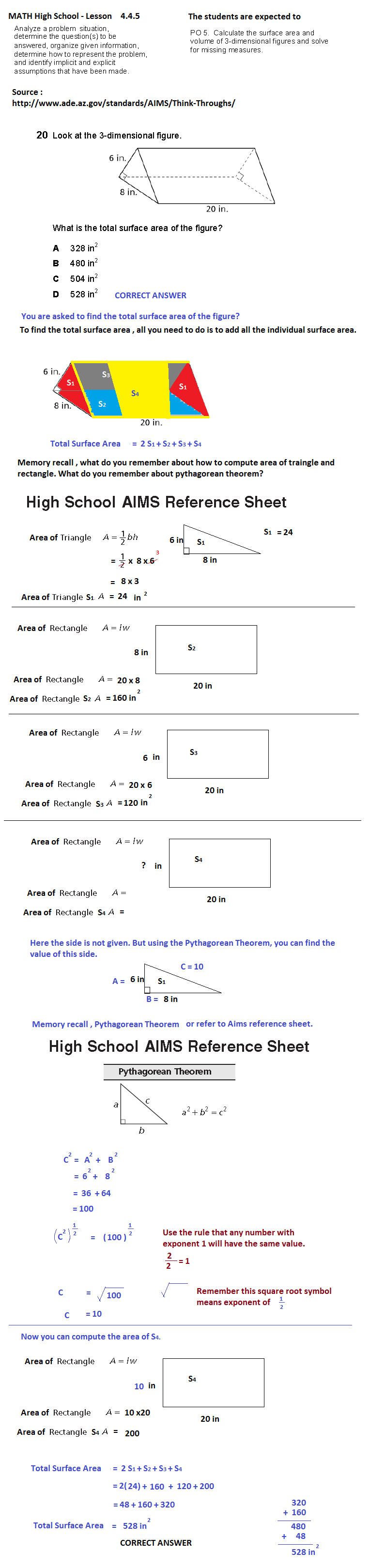 The State expected High School student to learn how to compute the surface area of 3-dimensional shape. The students are expected to learn how to use area of triangle, area of rectangle, and Pythagorean theorem in order to solve surface area problem.