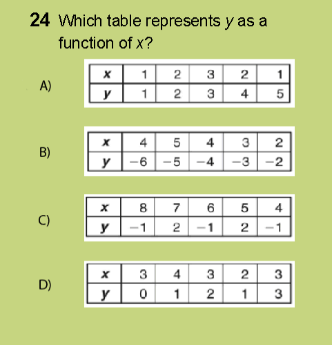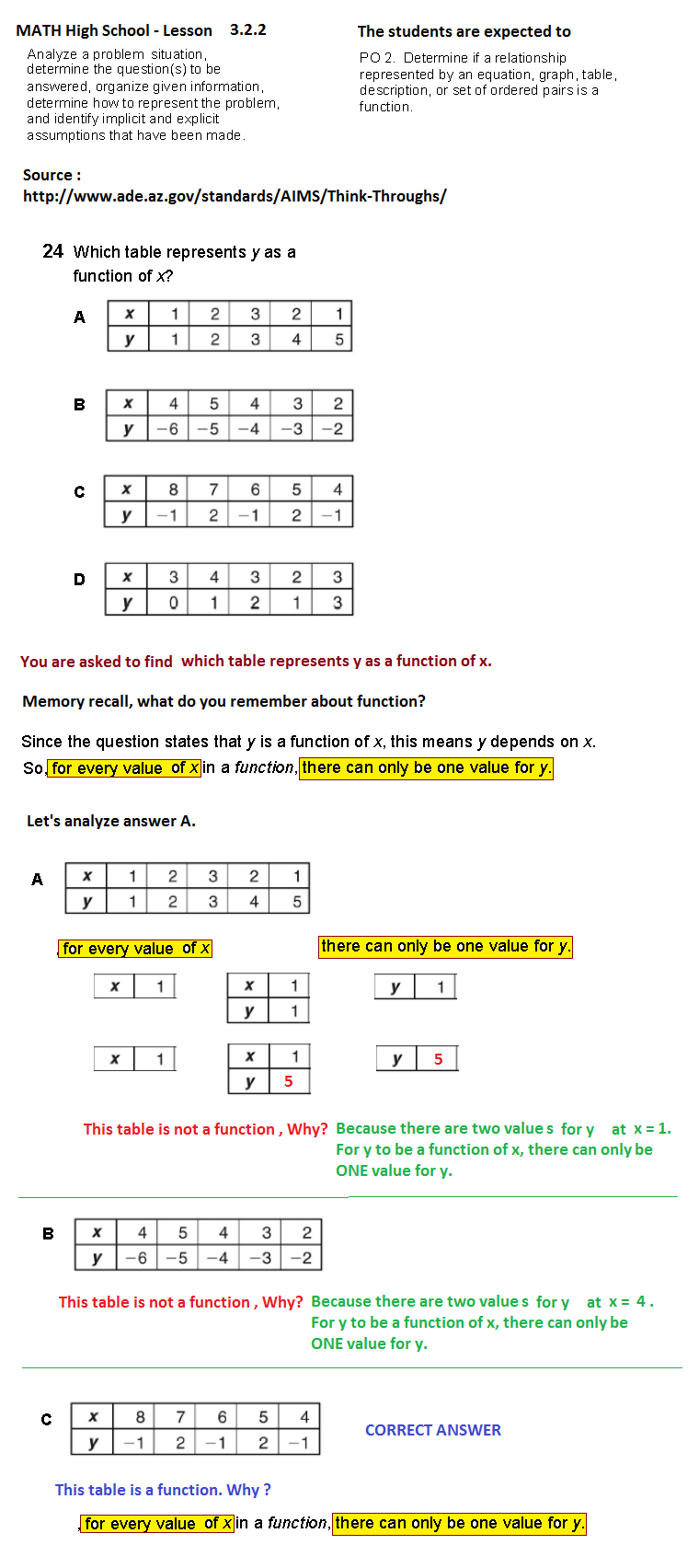 The State expected 8th grade student to determine if a relationship represented by an equation , graph, table, description or set of ordered pairs is a function. Student must understand the concept of function. What does it mean when we say y is a function of x? It means the value of y depends on the value of x. It means for every value of input x in a function, there can only be one output value for y.