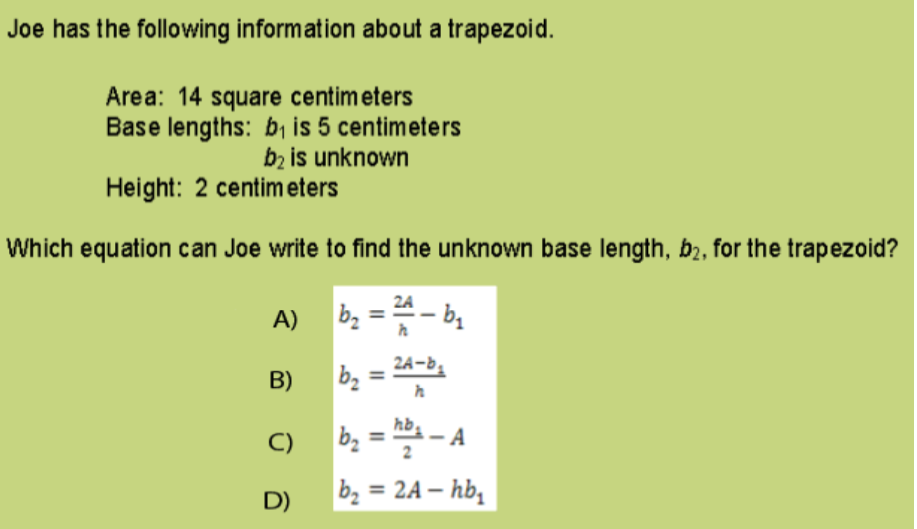 Next Next post: Which equation can Joe write to find the unknown base length, b2, for the trapezoid?